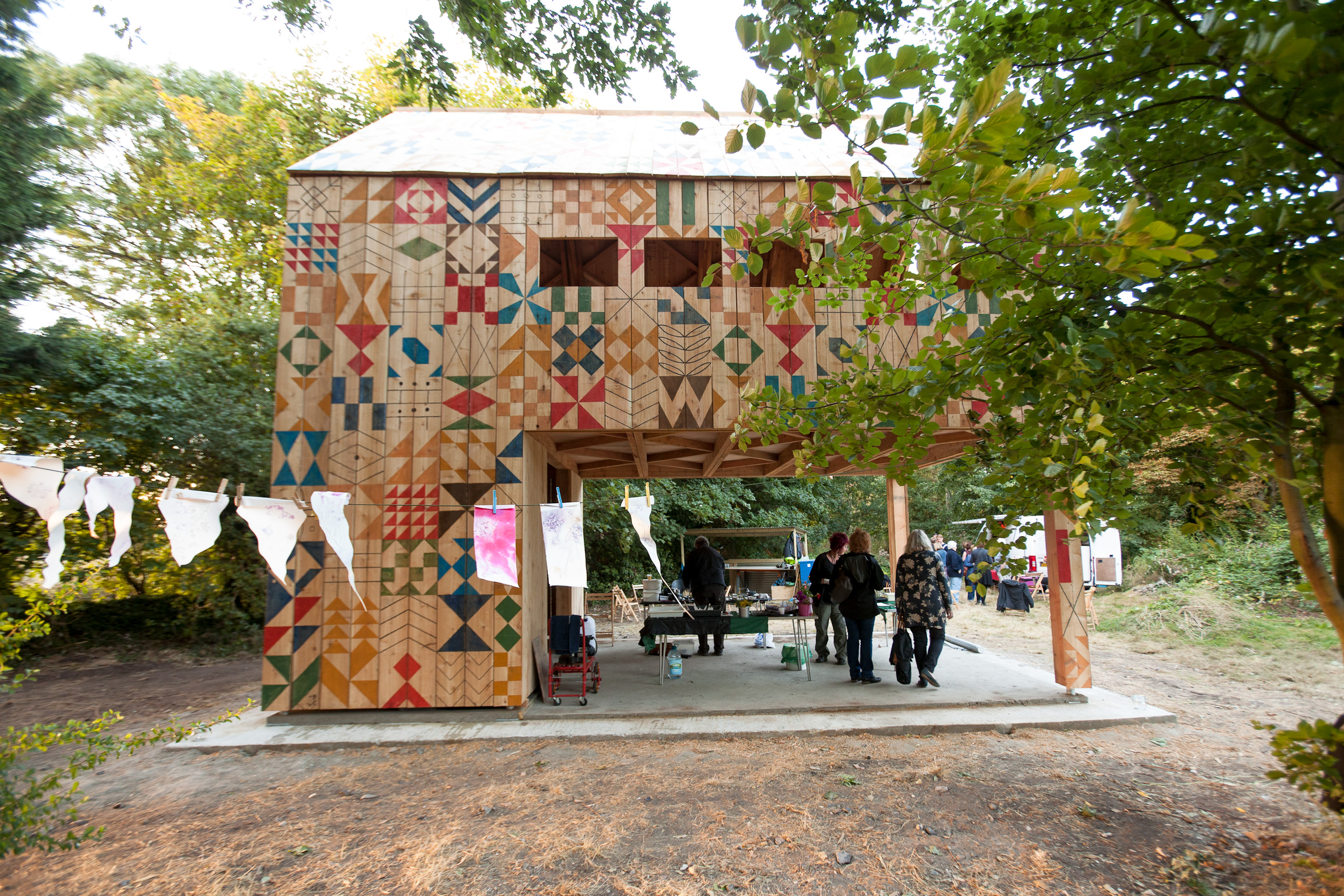 Located on an island park in Dartford, the Ecology of Colour is a timber outdoor classroom hand-painted with natural dyes.