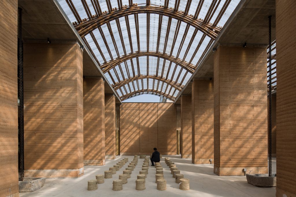 Rammed earth walls and bamboo at Terra Centre, KUST campus, China (2017) by One University One Village Team, Lead architect Edward Ng (Hong Kong) – featured in the TERRAFIBRA ARCHITECTURE exhibition