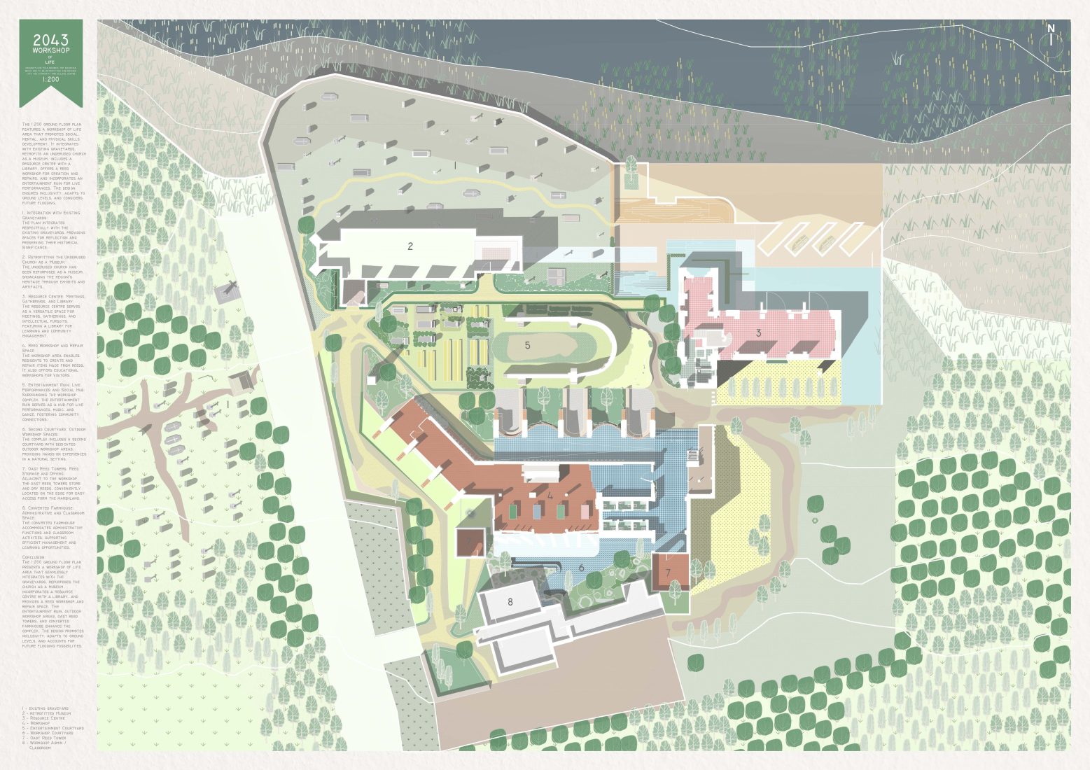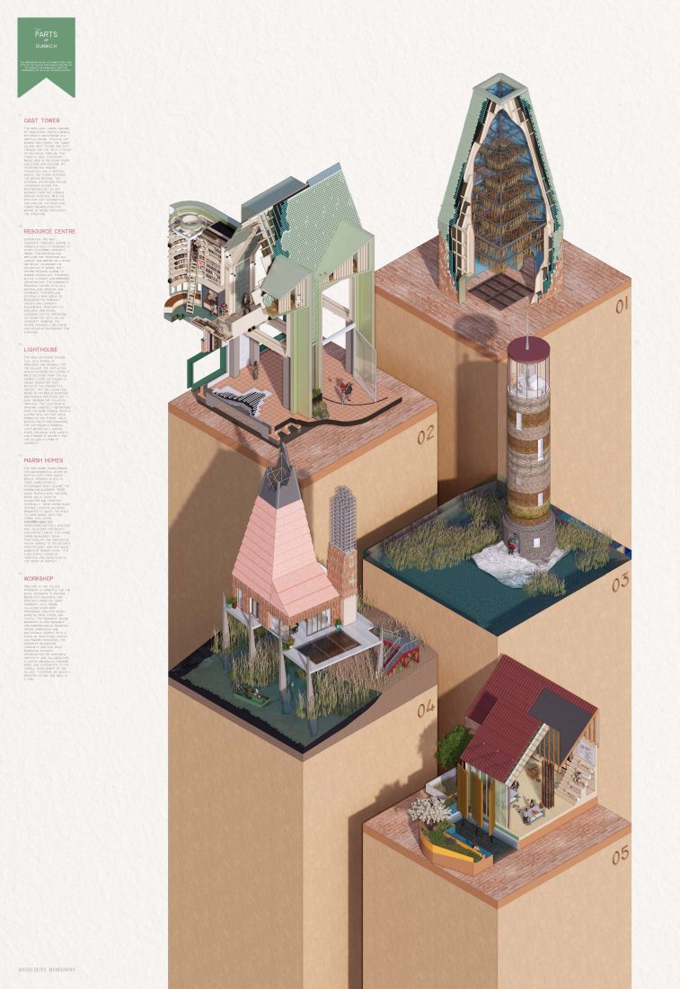 Architect apprentice Mehul Ashok Jethwa of De Montfort University won the postgraduate prize. His project Resilient Horizons: Safeguarding Suffolk’s Historic Coastal Villages from Climate Change was chosen by the judges for being 'playful and fun yet practical'. They were impressed by the 'evocative imagery' and 'convincing resolution'.