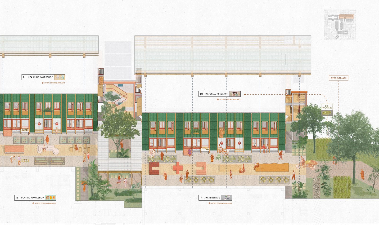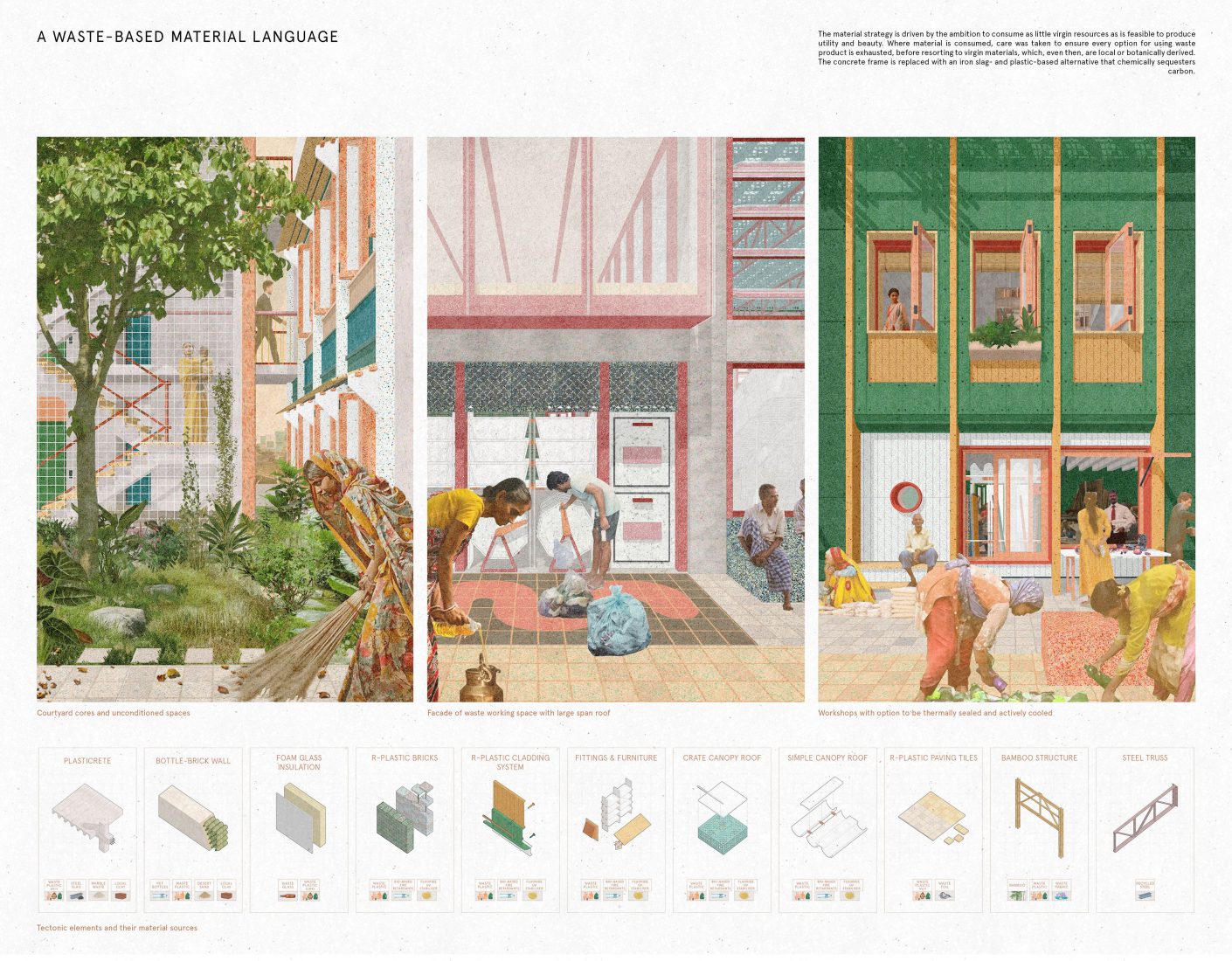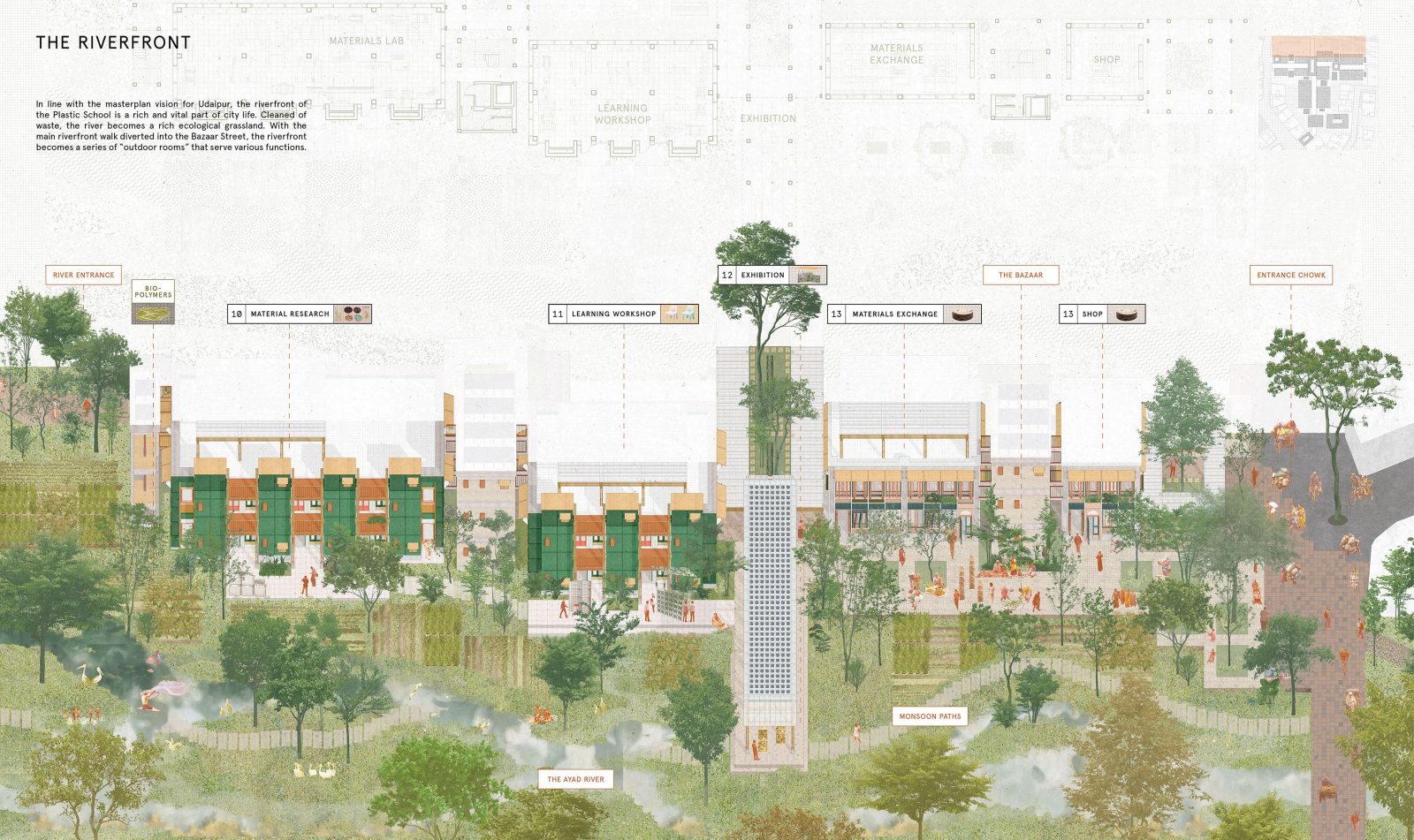 Finally, MArch student Shan Wei Chew of the University of Bath has taken the sustainability prize for The Udaipur Plastic School, a project that envisions a second life for Udaipur's waste plastic as pavements, shelters and buildings. The scheme is arranged around two public streets lined with the functions of plastic recycling, and inviting participation with the landscape providing materials for prototyping bioplastics.