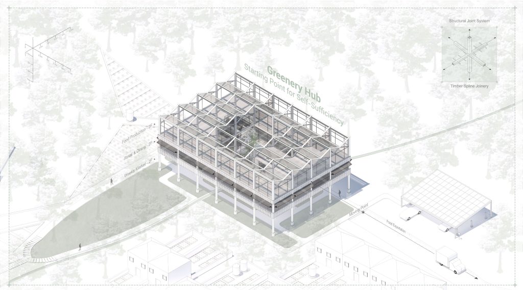 Project description Coal mining shifted the South Wales town of Treherbert’s focus from food cultivation to unsustainable resource extraction. The Greenery Hub addresses the negative effects by offering programmes focused on sustainable food production and consumption, designed to re-establish the town’s former self-sufficiency. The building is powered by renewable energy sources, while water and other materials are used efficiently and reused or recycled to minimise waste. The building features an adaptable, modular construction also made from waste. This is combined with timber from local trees, employed in an efficient spline joinery system.