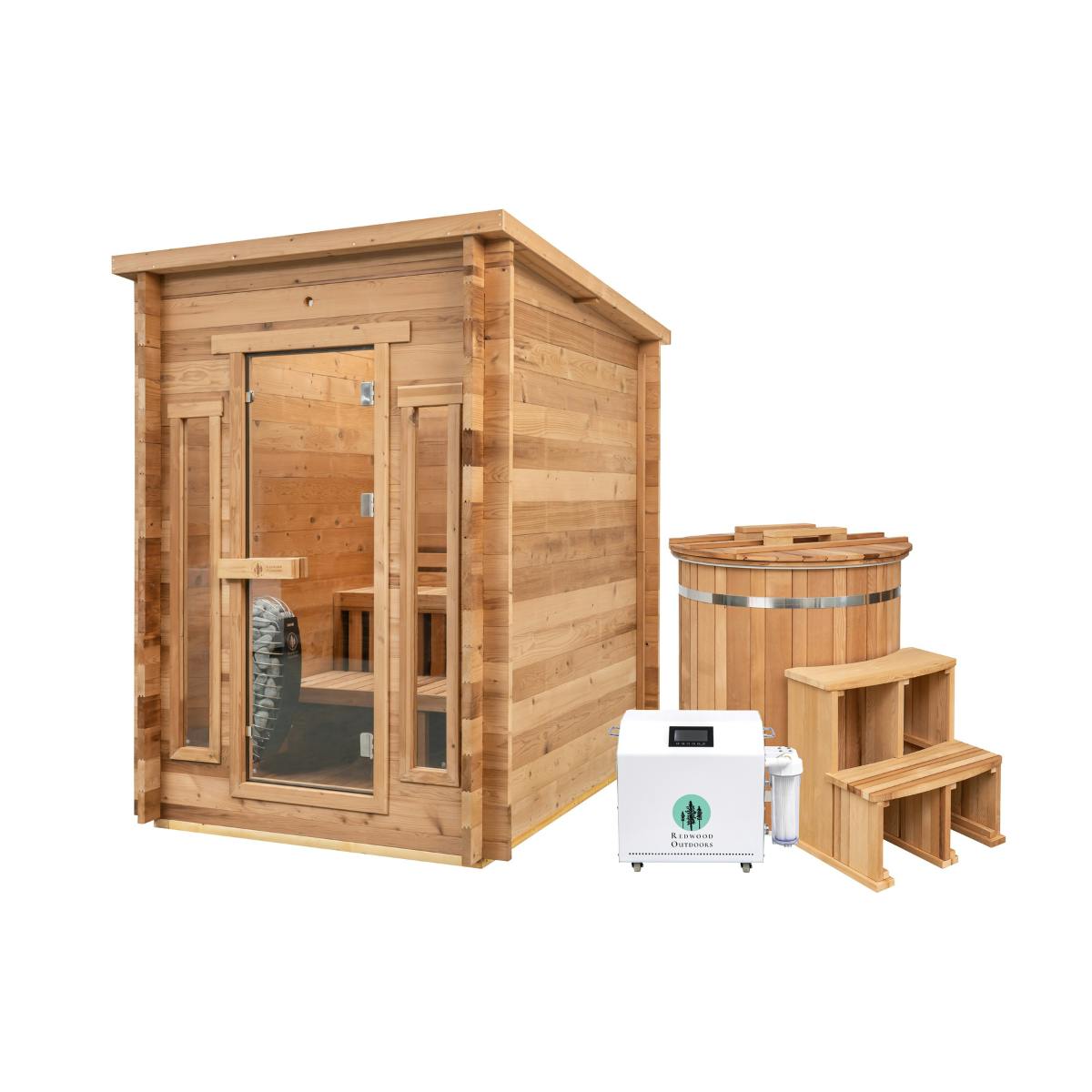 Create a backyard sanctuary with our Fire & Ice Bundle, featuring the spacious Cabin 4-Person Sauna and the powerful Alaskan All-In-One Cold Plunge Kit.