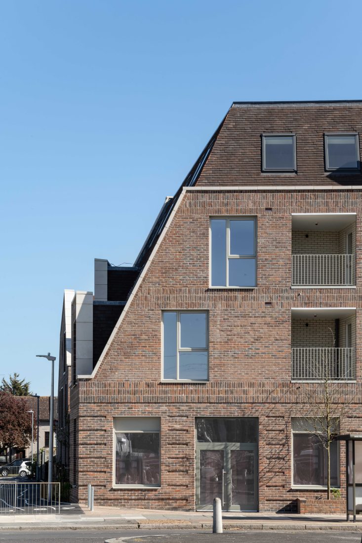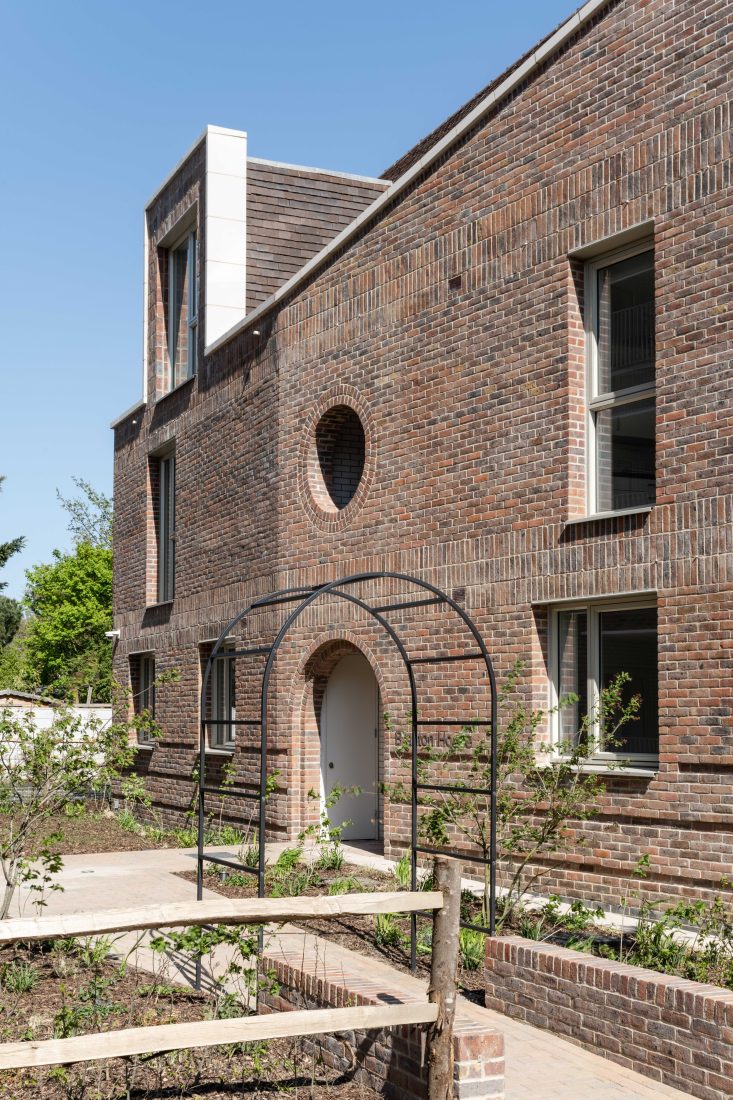 The new buildings, on the 0.4ha site of a former synagogue, playfully riff on details of nearby houses, such as semi-circular entrance arches and round windows, exaggerated dormers and undulating eaves lines. The building form helps minimise overlooking and overshading of neighbours and smooths the scale change from low-rise surrounding buildings to the denser, taller villas.