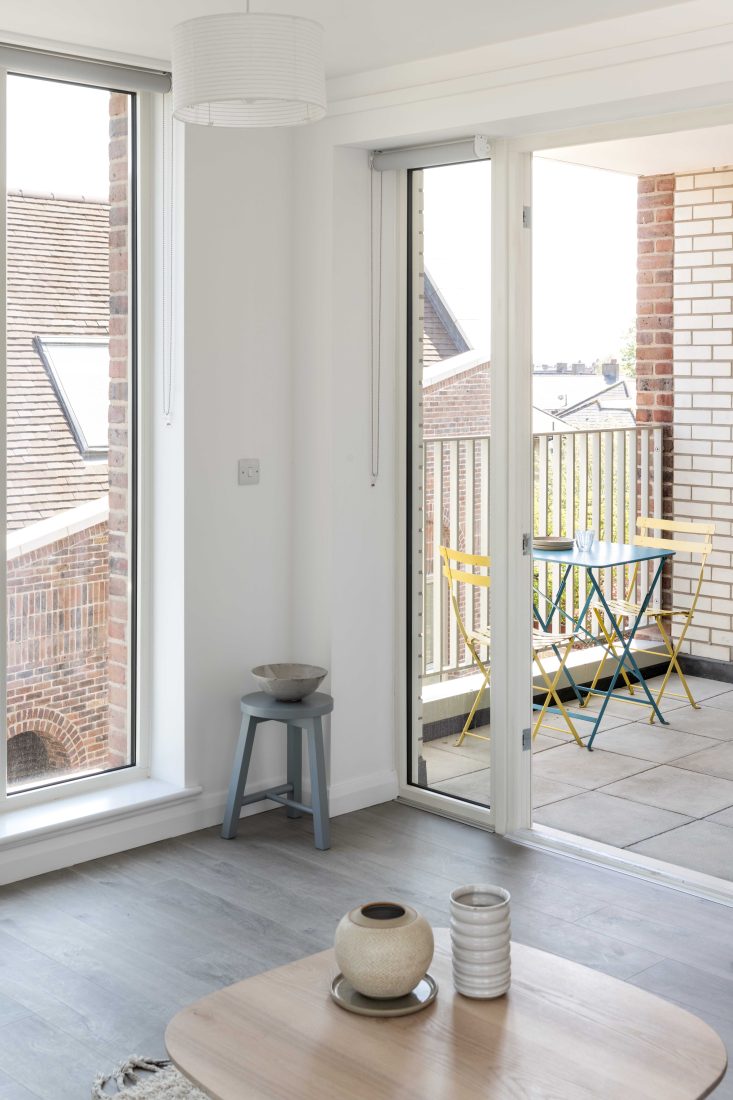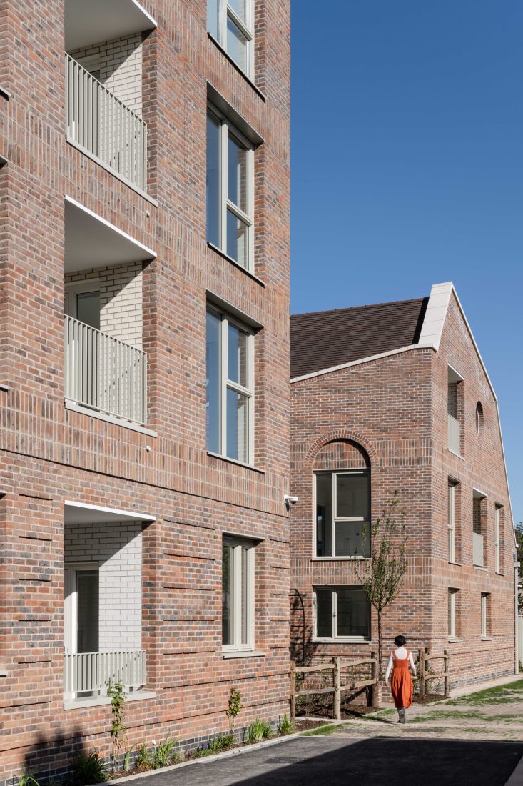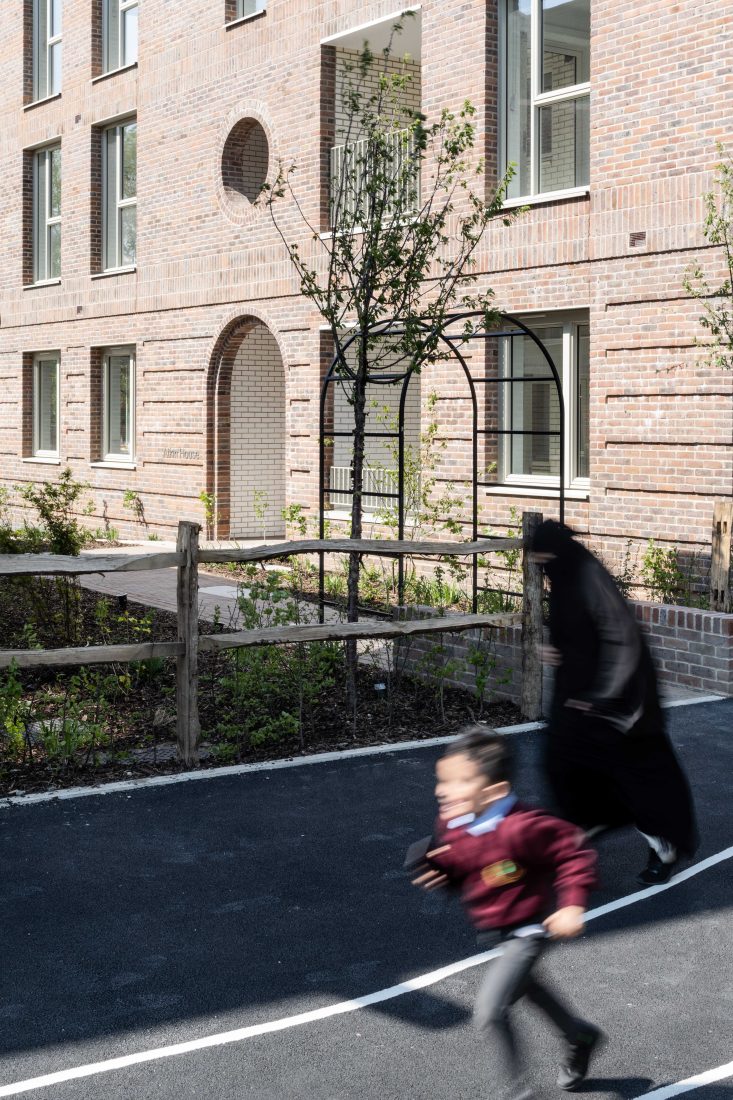 A particularly positive move has been the relandscaping of an adjacent pedestrian cut-through, School Way, into a play street linking to a local nursery. The large windows are another standout feature – quirky, individual, and plenty of them. Indeed, all the flats are triple-aspect, flooding them with natural light. Bedrooms are stacked vertically to minimise disruption as well as being located away from the main road and the entrances. Careful consideration has been given to developing robust and low-maintenance buildings through their layout and material specification. In combination with generously proportioned rooms and underfloor heating powered by air source heat pumps, the focus is on comfort and liveability.