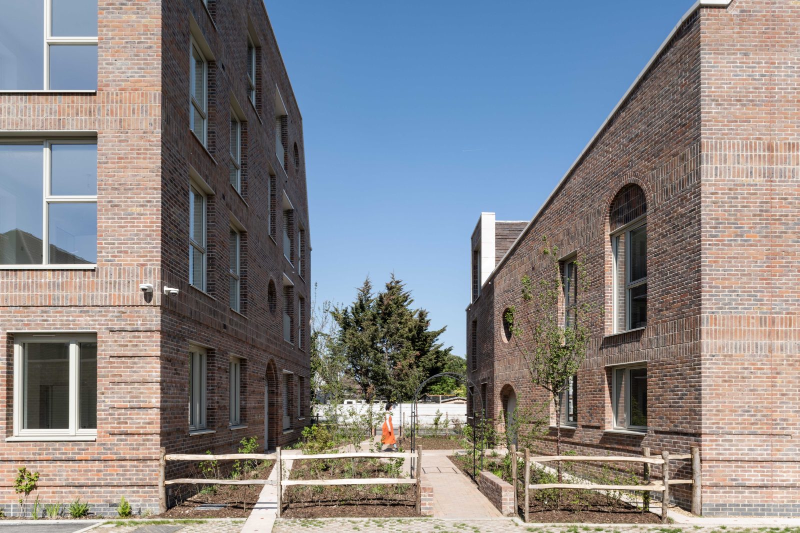 The Garden City principles used to design the original 1920s Becontree estate became a touchstone for Archio’s design strategy. The historic estate is predominantly single-family housing, so the practice looked to other London County Council developments for clues on how to develop a denser scheme. The practice drew on examples such as the Ossulston Estate in Camden, which echo the quality of Becontree at a civic scale.