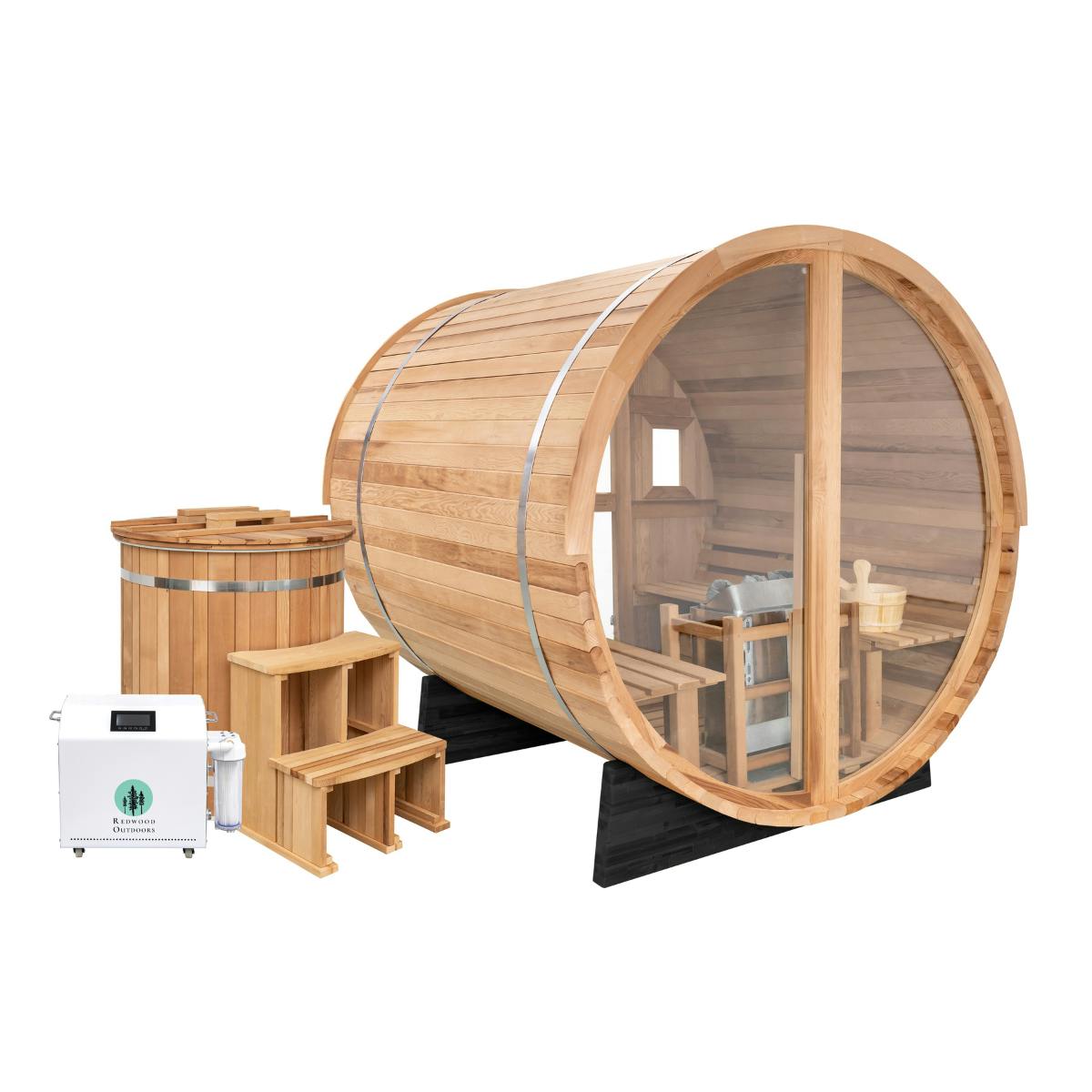 Transform your backyard into a wellness sanctuary with our Fire & Ice Bundle, featuring the stunning Vista Sauna and the Alaskan All-In-One Cold Plunge Kit.